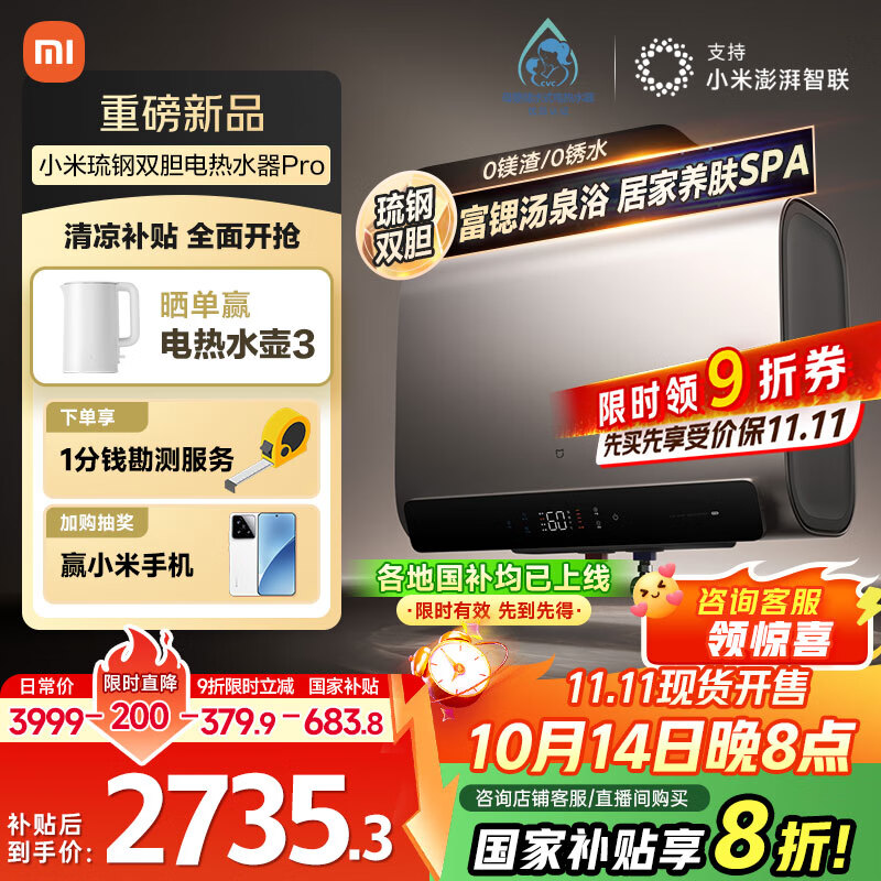 米家小米智能琉钢双胆电热水器60升Pro 3300W速热节能 富锶净垢一级能效国家补贴20%以旧换新MJ04
