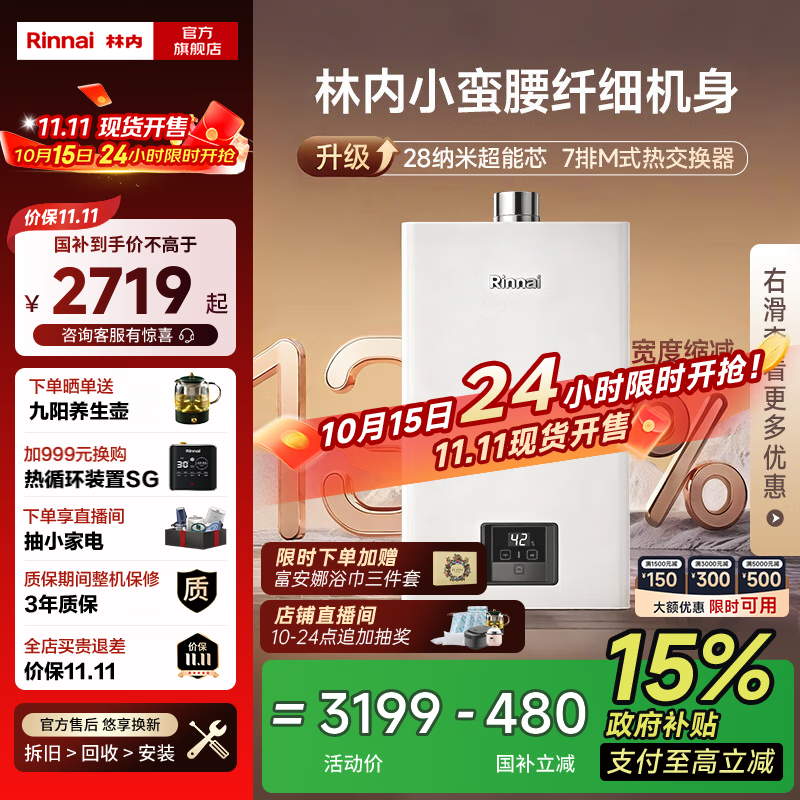 林内(Rinnai)【国家补贴立减15%】【小蛮腰】 燃气热水器天然气16升 恒温轻音 纤巧机身 16GD31 以旧换新 16L 【升级燃烧器 进口CPU】