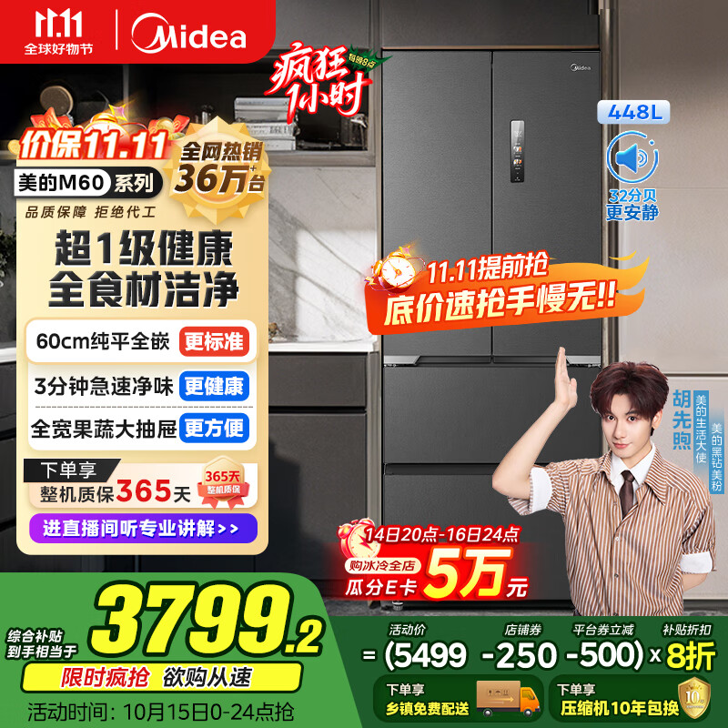 美的(Midea)M60全净470法式多门四门超薄平嵌除菌净味一级能效国家补贴20%家用冰箱无霜MR-470WUFPZE底部散热