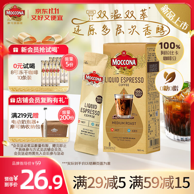摩可纳(Moccona)浓缩咖啡液中度烘培20ml*8 0糖0脂冷萃拿铁冰美式 黑咖啡即饮饮料