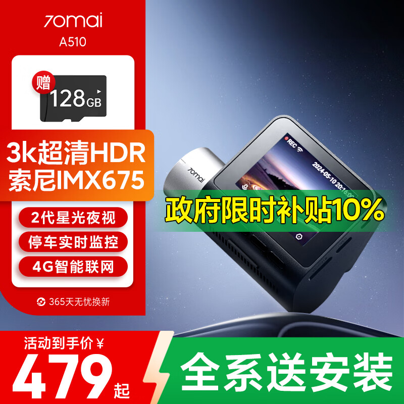 70迈行车记录仪A510 1944P超高清星光夜视 停车监控 前后双录4G网联