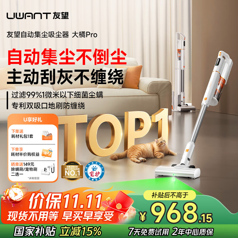 uwant友望吸尘器大橘Pro自集尘洗【专利防缠 仿生机械刮环】广角绿光显尘大吸力无线手持家用扫地除螨仪