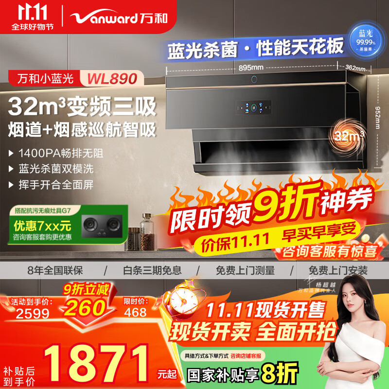 万和(Vanward)【小双翼WL890·蓝光杀菌·烟感联动】顶侧双吸抽排油烟机家用32风量大吸力变频三吸国家补贴20%