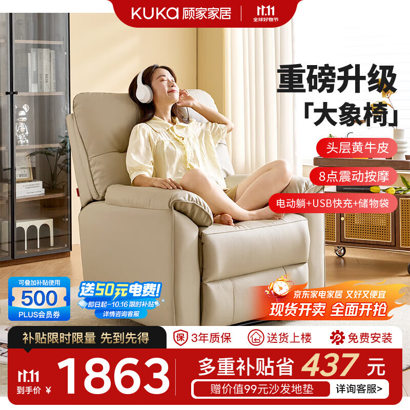 顾家家居真皮按摩沙发客厅单人沙发懒人沙发摇椅卧室书房家用小型按摩椅大象椅PTDK851FY