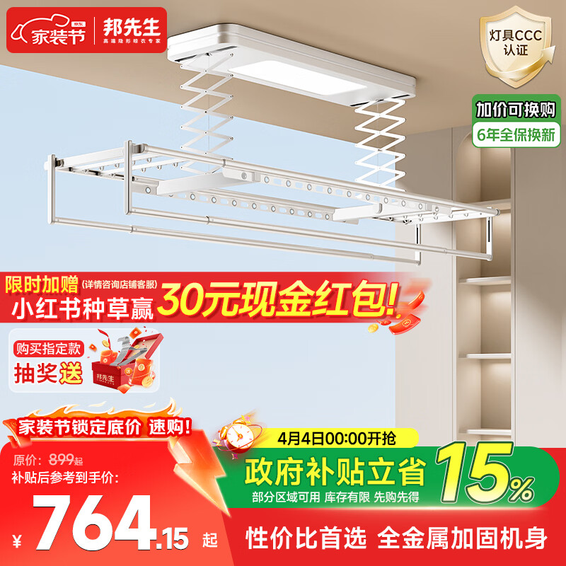 邦先生电动晾衣架智能小阳台全自动升降伸缩遥控家用晾晒衣杆机M50A白