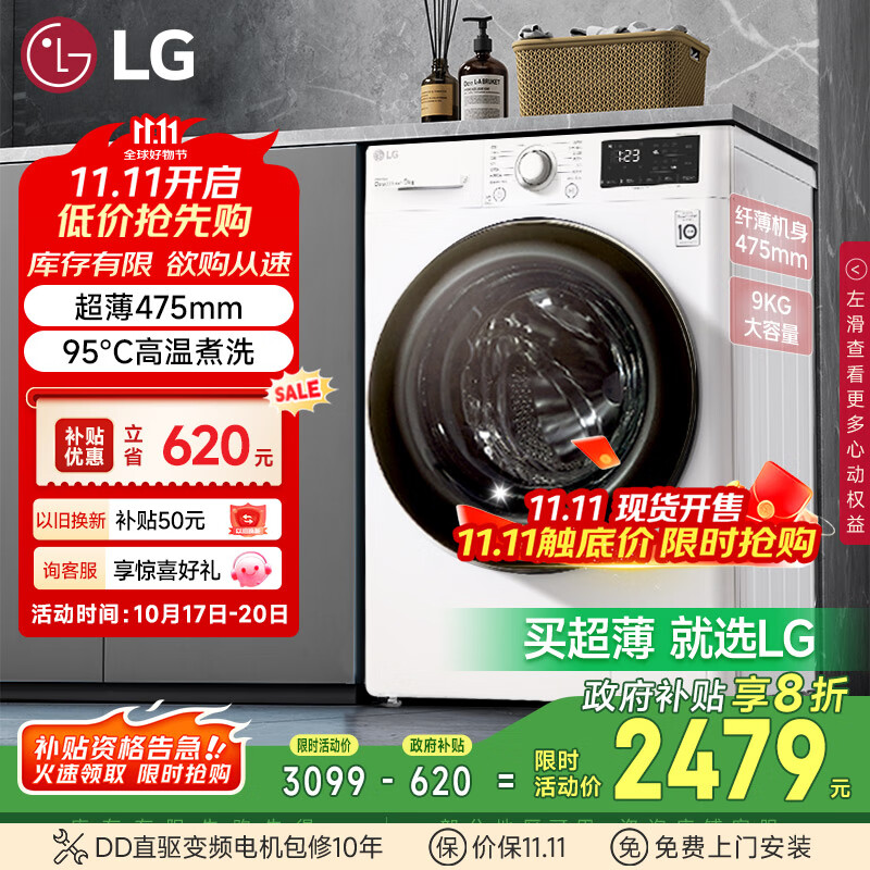 LG9公斤滚筒洗衣机全自动 475mm超薄机身 AI直驱变频洗衣机家用小户型 白 FCY90N2W国家补贴以旧换新
