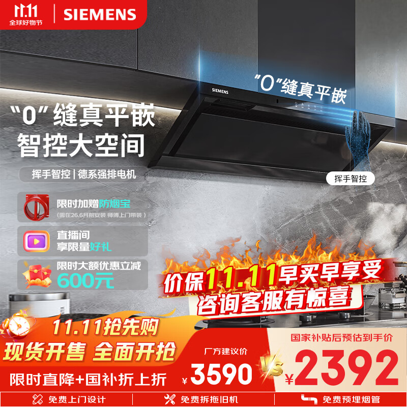 西门子(SIEMENS)【风量不虚标】锥锋Air+顶侧平嵌抽油烟机 大吸力油烟机一级能效国家补贴可组套装LSAJ2C1BNW