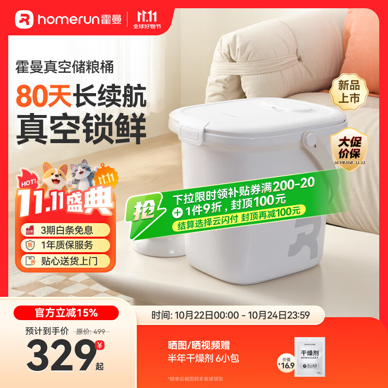 霍曼(Homerun)真空储粮桶猫粮狗粮桶宠物储存桶密封防潮锁鲜防虫长续航