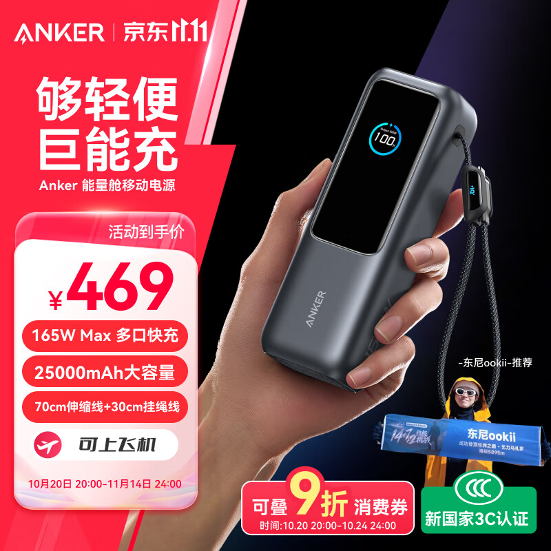 ANKER安克能量舱【新3C认证可上飞机】东尼ookii推荐165W充电宝超大容量自带伸缩线25000毫安苹果17锖