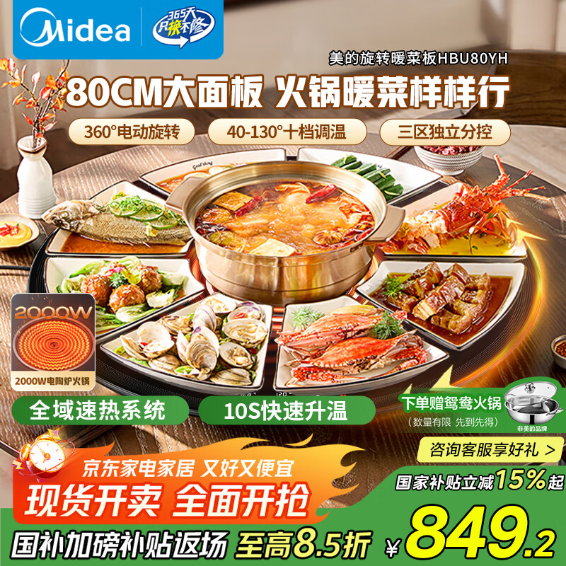 美的(Midea)小欢聚暖菜板加热板热菜板保温板 2000W电陶炉火锅家用旋转餐桌转盘政府补贴(圆形80CM)HBU80YH