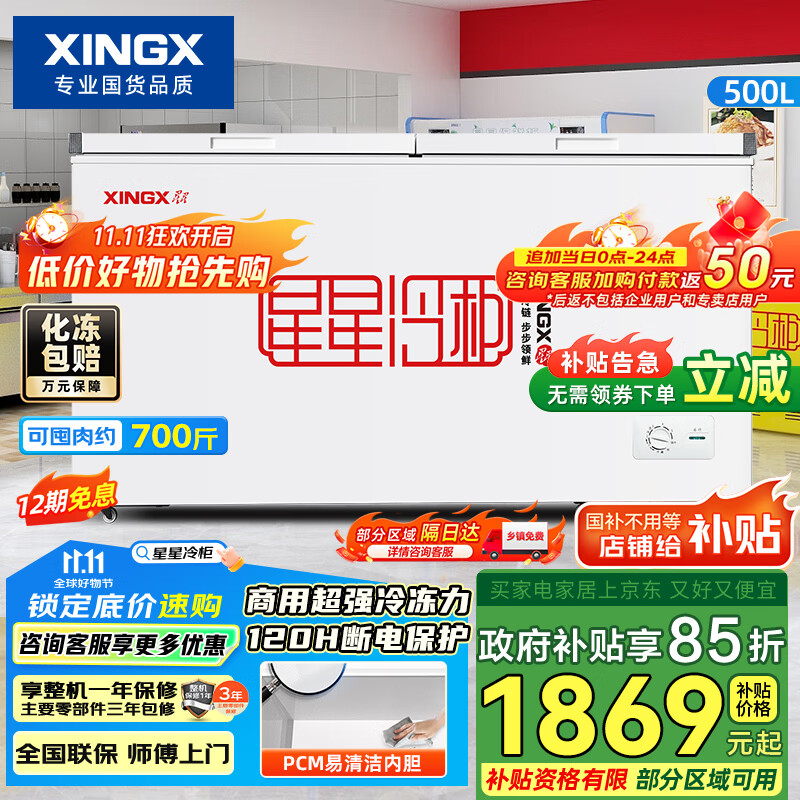 星星(XINGX) 500升 大容积卧式单温冰柜 冷藏冷冻转换冷柜 单箱变温冰箱 BD/BC-500R国家补贴