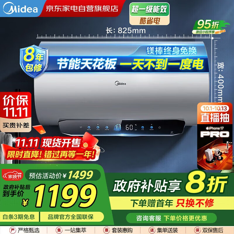 美的(Midea)电热水器60L超一级能效酷省电终身免换镁棒免清洗3300W速热双管变频加热TP1升级 F6033-TP3(HE)