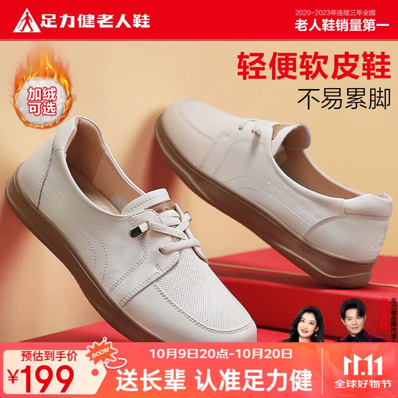 足力健老人鞋秋季女士单鞋软底休闲皮鞋中老年妈妈鞋乐福鞋 8691K米色39