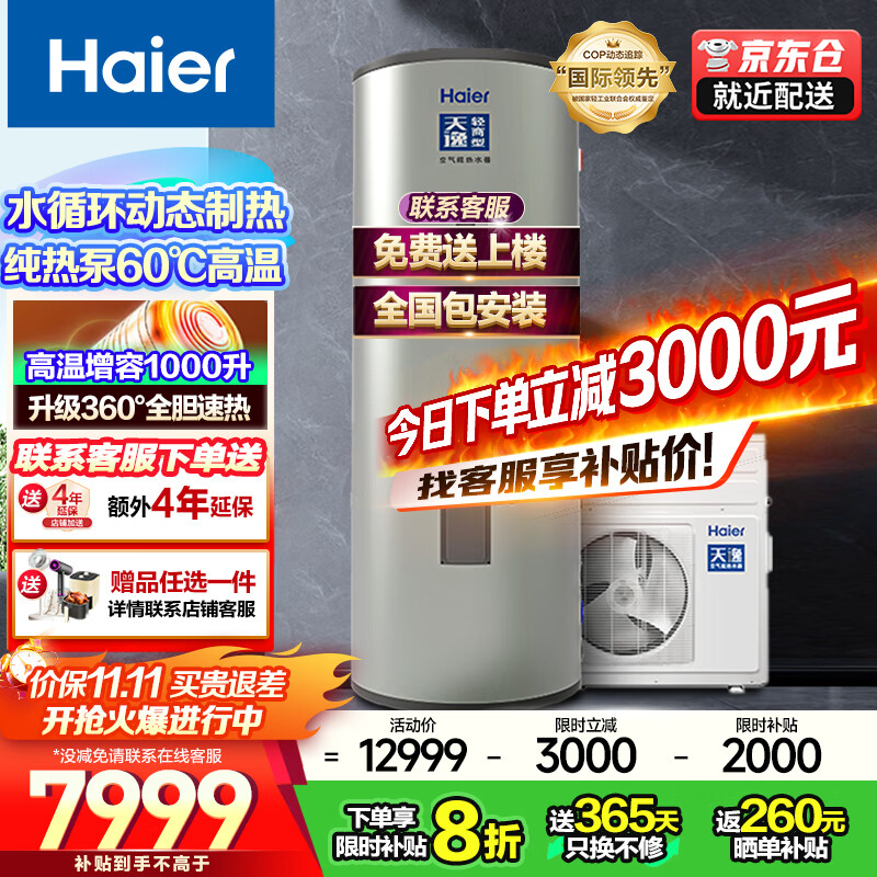 海尔(Haier)0元安装商用空气能热水器500升速热3匹空气源热泵别墅家用酒店旅宾馆美容饭店洗澡用以旧换新补贴 500升水循环60℃高水温【0元装】