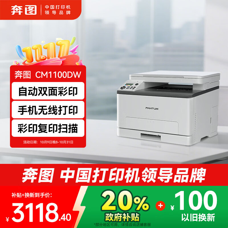 奔图(PANTUM)CM1100DW 彩色激光打印机家用办公 复印扫描一体机 无线打印 自动双面彩印【享8折补贴】