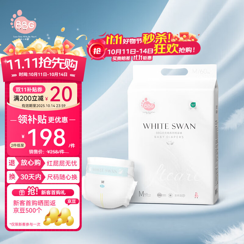 BBG白天鹅系列婴儿纸尿裤M码60片(5-9kg)尿不湿珍稀天鹅绒柔轻薄透气