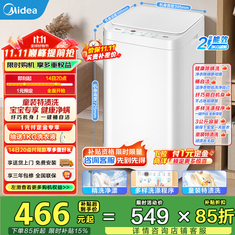 美的(Midea)婴儿洗衣机全自动 3公斤小型迷你波轮母婴儿童内衣裤袜洗衣机健康除螨洗家电国家补贴 MB30V21EPLUS