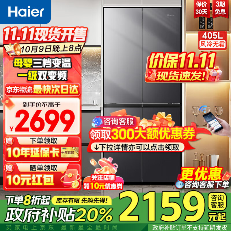 海尔冰箱405L冰箱双开门冰箱十字门一级能效海尔家用冰箱嵌入式一级能效国家补贴海尔电冰箱冰箱以旧换 405升三档变温家用冰箱