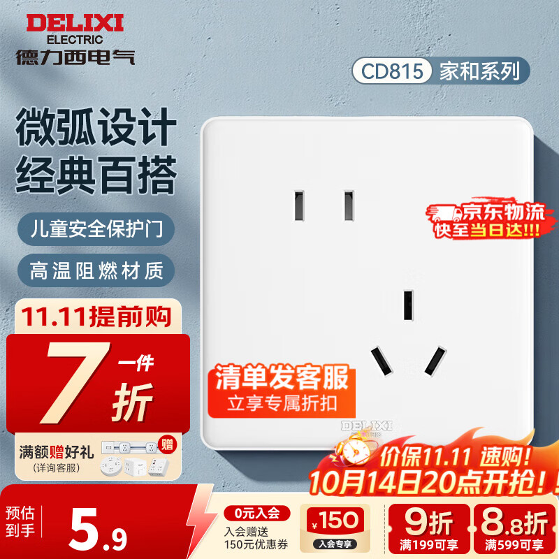 德力西(DELIXI)开关插座面板 CD815白色升级款暗装墙壁86型电源开关插座家装建材 斜五孔插座