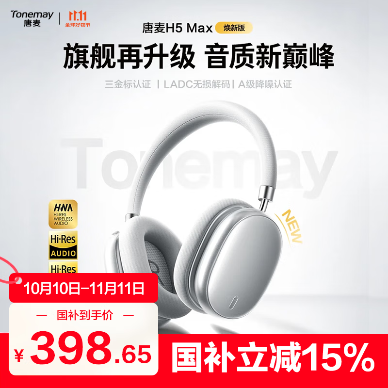 唐麦H5 MAX焕新版蓝牙耳机头戴式主动降噪无线音乐电竞游戏运动隔音适用苹果华为小米手机男女礼物银色