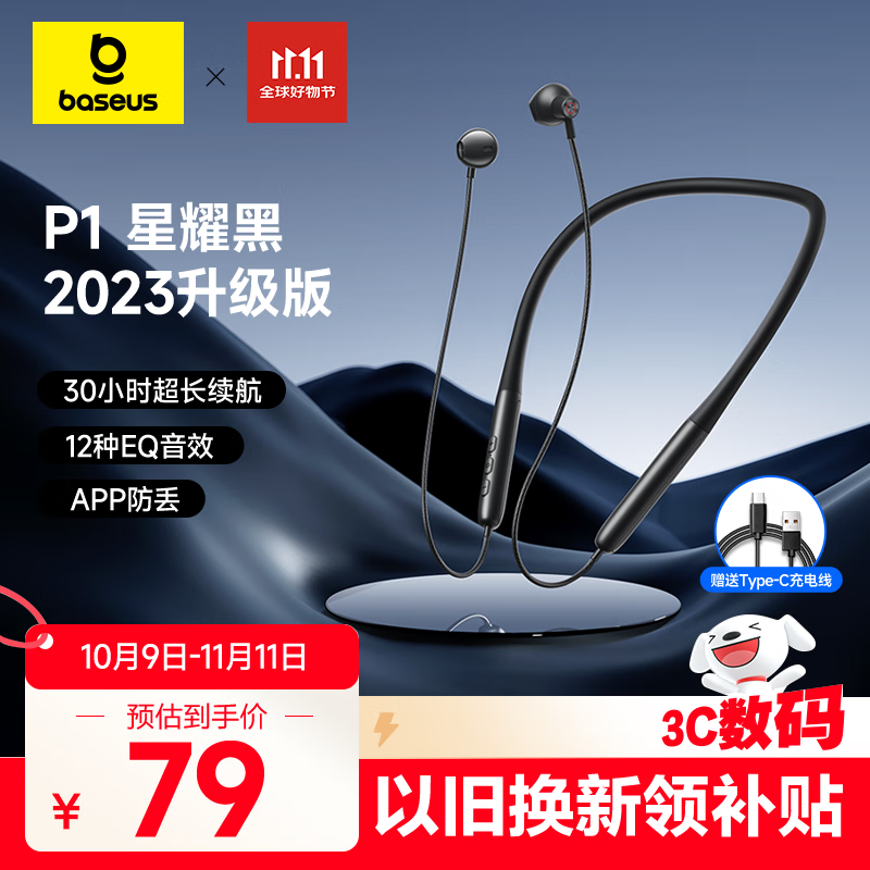 倍思P1升级版颈挂式蓝牙耳机超长续航运动音乐跑步手机耳机适用苹果华为vivo荣耀OPPO手机