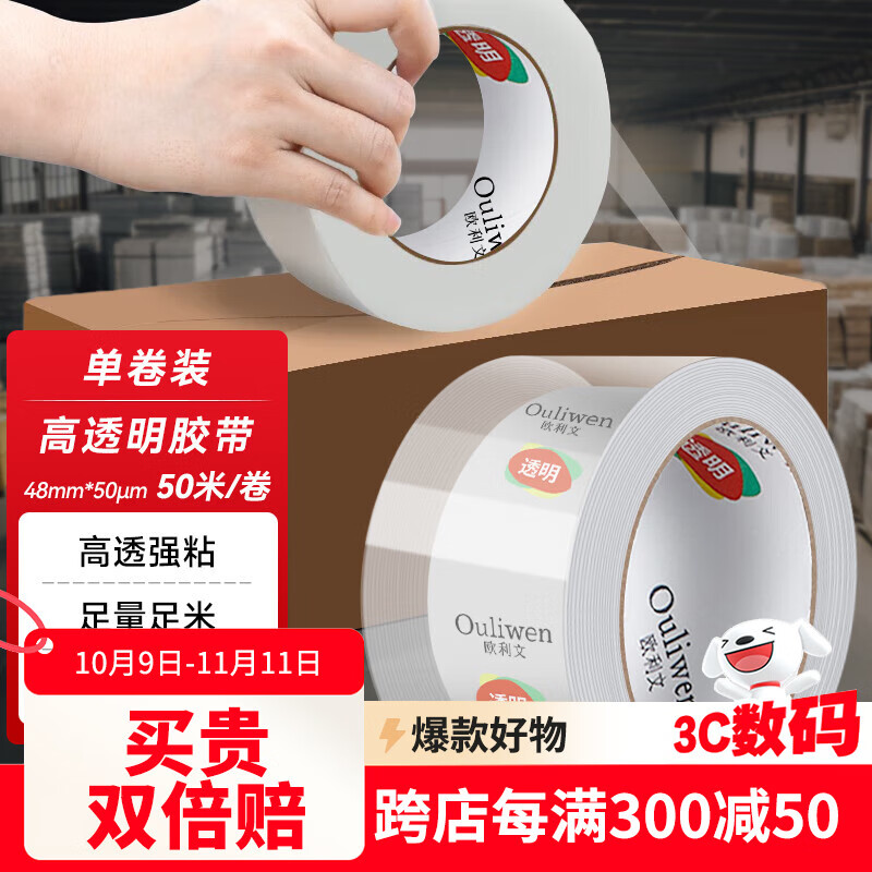 欧利文透明胶带仓库快递封箱打包超透胶带家用办公 48mm*50m*50um 单卷装