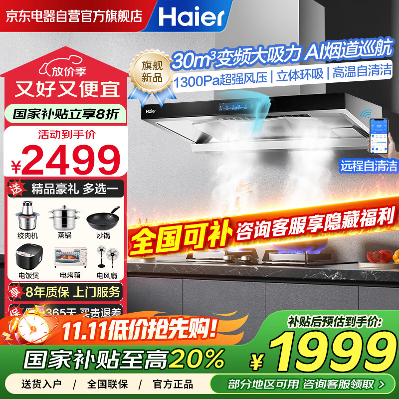 海尔(Haier)抽油烟机 新欧式顶吸30立方立体环吸大风量 1300PA大风压 国家补贴20% 高频热熔自清洁烟机ET937UD