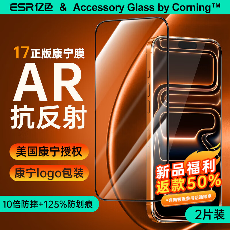 亿色【7层AR抗反射康宁膜】适用iPhone17ProMax钢化膜苹果17pro手机膜康宁玻璃17pm全屏防指纹无尘贴膜 【2片装】苹果17ProMax 正版康宁膜 美国康宁授权丨17同款AR抗反射