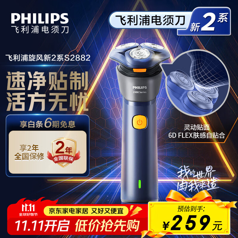 飞利浦剃须刀电动剃须刀飞利浦新一代旋风2系刮胡刀净剃6D自贴合刀头 礼品生日礼物送男友 官方旗舰店 【新品】新一代旋风2系S2882/02