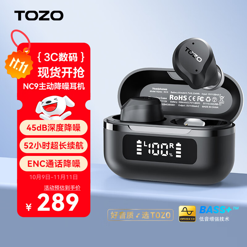 TOZO NC9真无线主动降噪蓝牙耳机入耳式52小时超长续航高保真音质IPX8防水运动耳机适用苹果华为小米