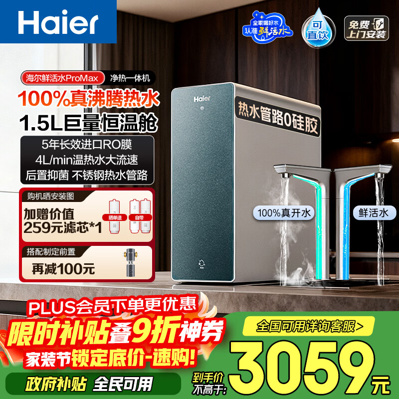 海尔(Haier)净水器鲜活水ProMax1000G加热直饮一体机2.0抑菌厨下净热5年长效RO膜家用厨房专用台下净水机