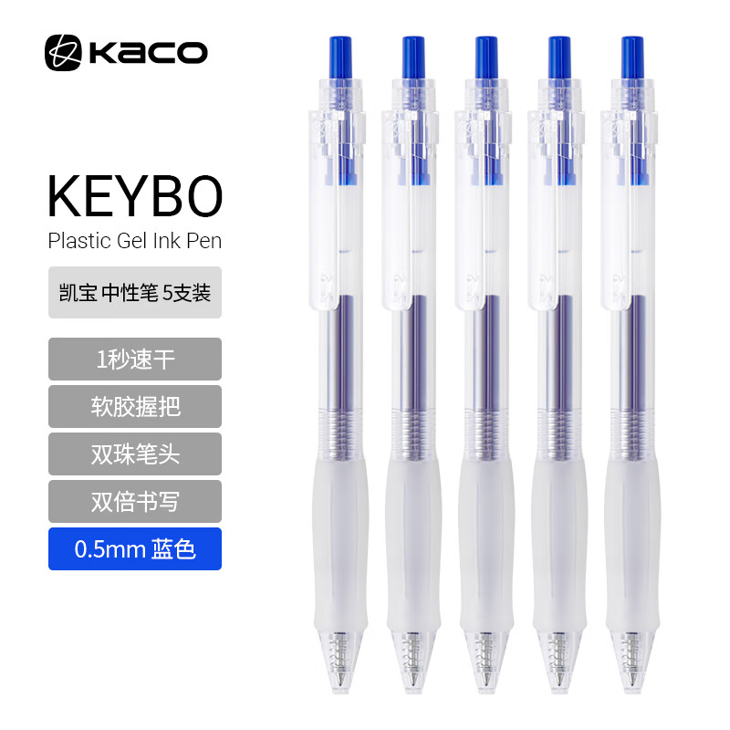【开学必备】KACO蓝色中性笔透明笔杆0.5mm子弹头学生标记签字笔 水笔 5支装蓝色