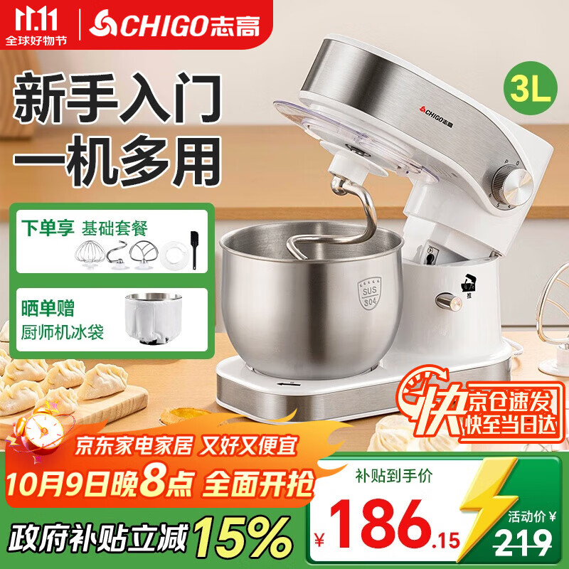 志高(CHIGO)厨师机家用和面机揉面机多功能揉面和面打发一体奶油全自动和面出膜活面机面粉搅拌机 600W功率丨 3L 容量丨基础套餐