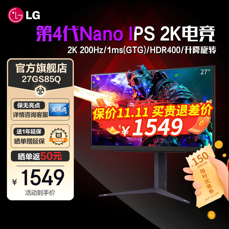 LG 27GS85Q 27英寸 NanoIPS 2K显示器 200Hz 1ms(GTG) 游戏电竞显示器 HDR400 第4代Nano 升降旋转 27GS85Q 4代NanoIPS 2K/200Hz