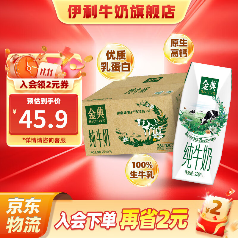 伊利金典纯牛奶250ml*16盒/箱 3.6g优质乳蛋白 100%生牛乳 100%生牛乳