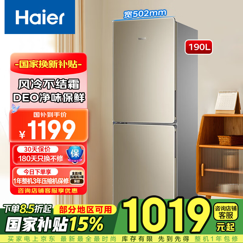 海尔冰箱双开门小型190升风冷无霜智能节能省电低噪冷藏冷冻两门家用租房电冰箱以旧换新家电国家补贴 【190升】风冷无霜+DEO净味+日耗电0.7°