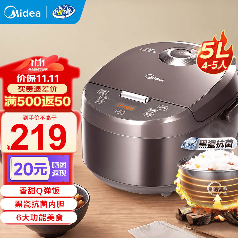 美的(Midea)电饭煲家用3-4-5-8个人电饭锅5升大容量黑瓷抗菌内胆6大菜单24小时预约定时5L焖香智能快速饭微压 【黑瓷抗菌耐磨】大容量- 5L