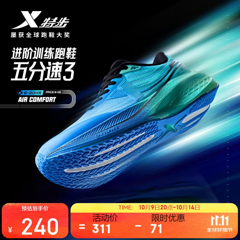 特步五分速3男跑鞋运动鞋秋季新款网面透气轻便减震男子跑步鞋