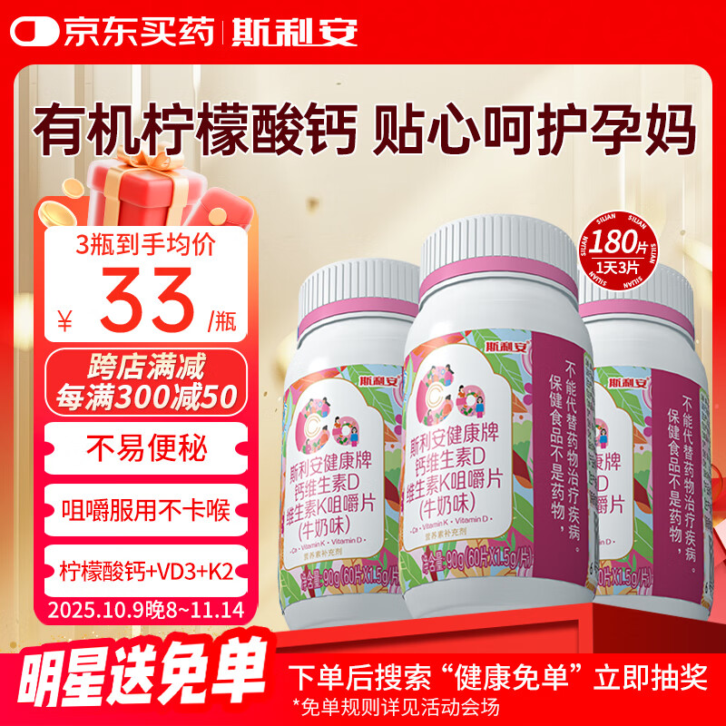 斯利安康孕妇钙维生素d3k2牛奶味咀嚼片180片 女士哺乳期柠檬酸钙中老年