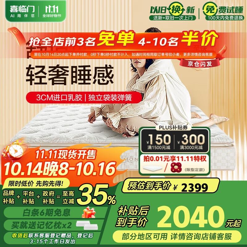喜临门抑菌防螨3cm高纯乳胶床垫 独袋弹簧床垫 舒缦3.0 1.8x2米偏软