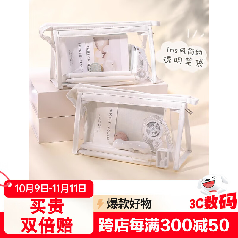 离草透明笔袋防水高颜值透明文具袋考试专用大容量文具盒笔盒透明笔袋日系ins风学生必备 透明白