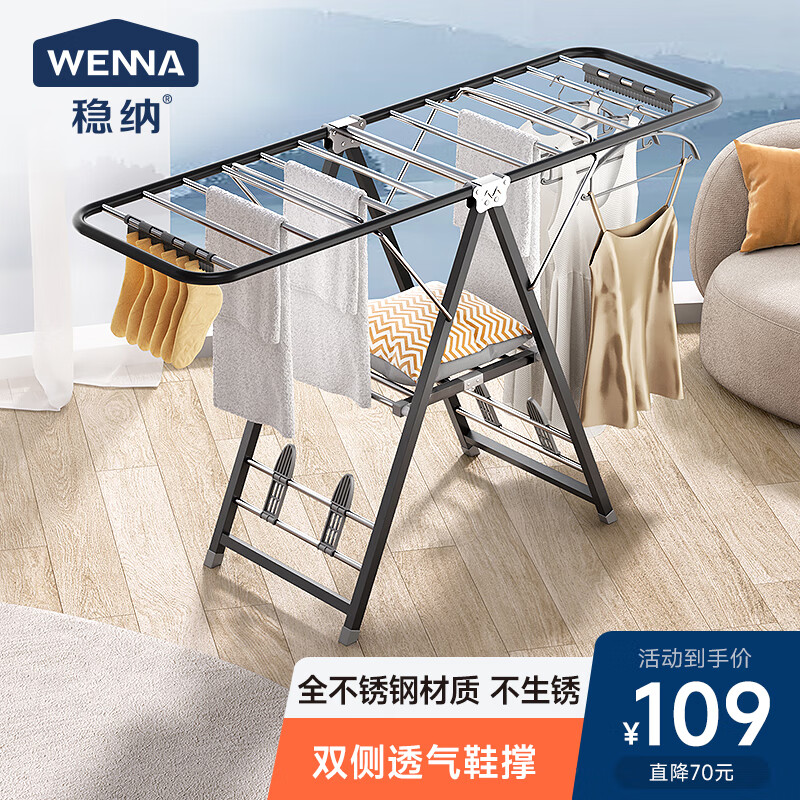 稳纳晾衣架落地折叠挂衣架晾衣杆晒被架不锈钢晒衣服架翼型折叠晾衣架