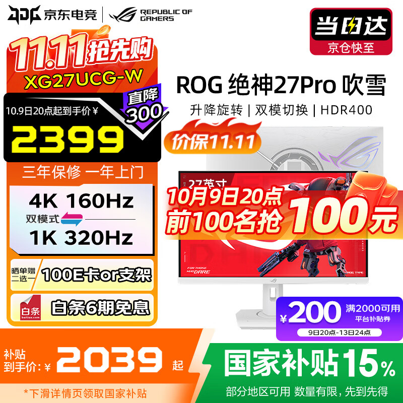 华硕(ASUS)ROG 绝神Pro 27英寸显示器4K电竞显示器4K显示器 4K 160Hz双模1K 320Hz HDR400RA 双模切换丨XG27UCG-W 吹雪白