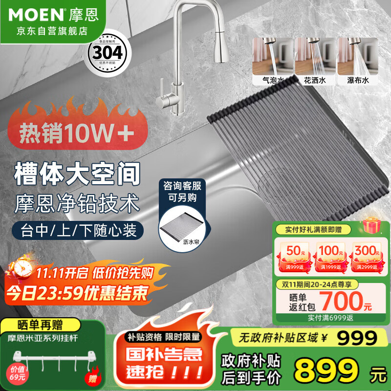 摩恩(MOEN)304不锈钢厨房水槽洗菜盆拉丝防腐一体拉伸大单槽SK42511C01套装