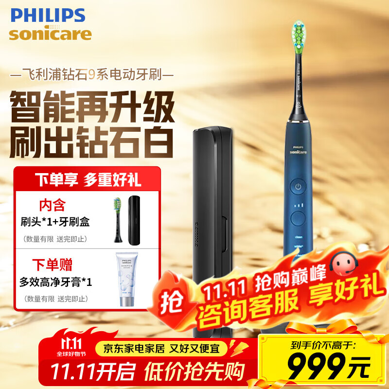 飞利浦(PHILIPS)电动牙刷钻石9系可视化洁齿磁悬浮动力微泡水流成人-牙医推荐 送男友女友生日礼物 HX9911 钻9-HX9911/62水手蓝