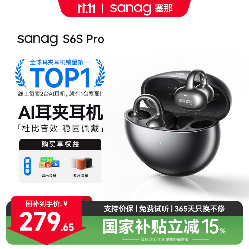 SANAG塞那S6S Pro蓝牙耳机耳夹骨传导概念开放式无线夹耳式不入耳听力保护运动跑步通话降噪耳夹耳机