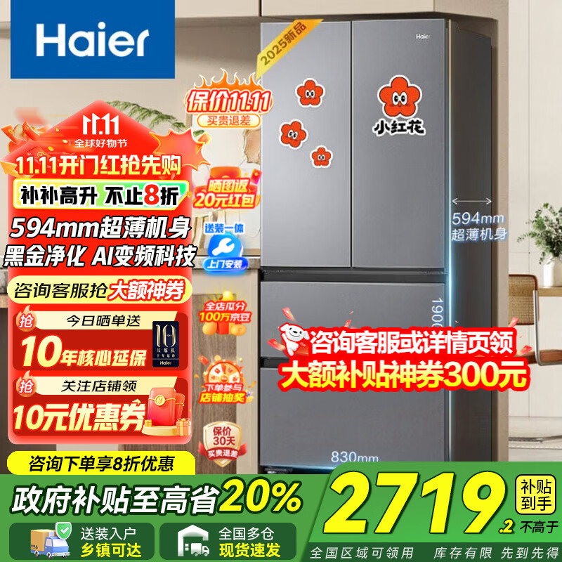 海尔冰箱法式多门四开门488升超薄可嵌入小红花系列一级能效风冷无霜黑金净化【25年新品】国家补贴20% 594mm超薄+母婴三档变温+AI变频科技