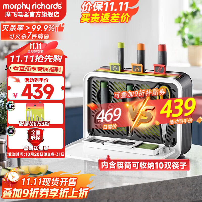 摩飞电器(Morphyrichards)刀具消毒一体机刀架菜板刀具消毒机分类菜板砧板筷子消毒烘干一体机套装MR1002 【三代】六刀三板+筷桶 MR1002