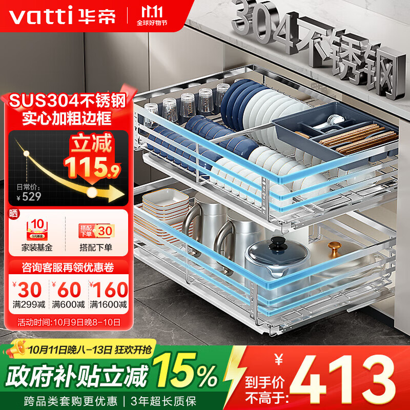 华帝(VATTI)【国家补贴15%】厨房拉篮抽屉式橱柜收纳调味碗篮碗碟架304不锈钢