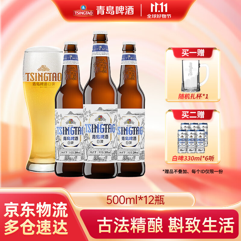 青岛啤酒(TsingTao)全麦白啤精选麦芽酿造瓶装箱啤 原麦汁浓度10°P 500mL 12瓶 整箱装